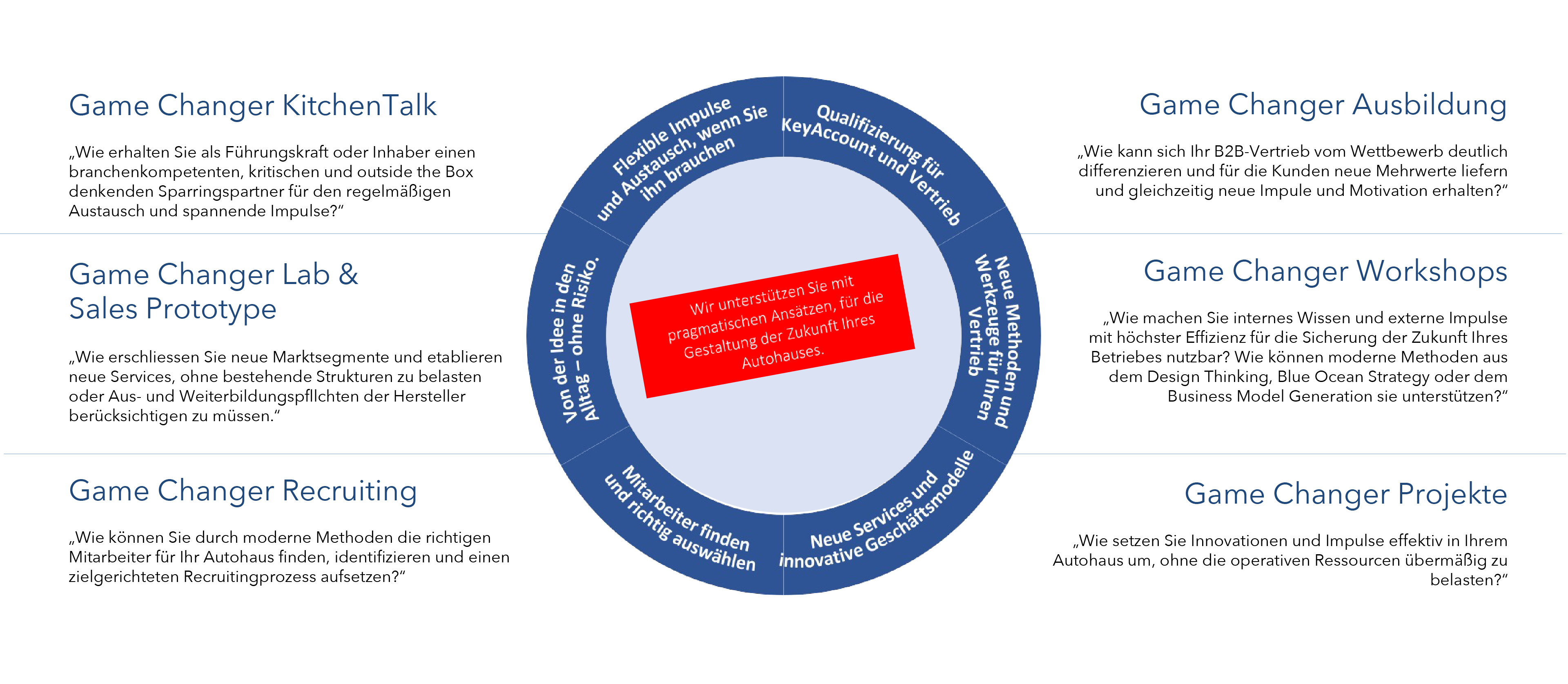 Gestalten Sie mit dem Game Changer Ansatz von Revenue Maker und einem Perspektivwechsel die Zukunft für IHR Autohaus und schaffen Sie Individualität, Identität und Relevanz für Ihre Kunden. Unsere pragmatischen Werkzeuge und Leistungen für TECHNO-Gesellschafter beziehen sich auf folgende Unternehmensbereiche:
